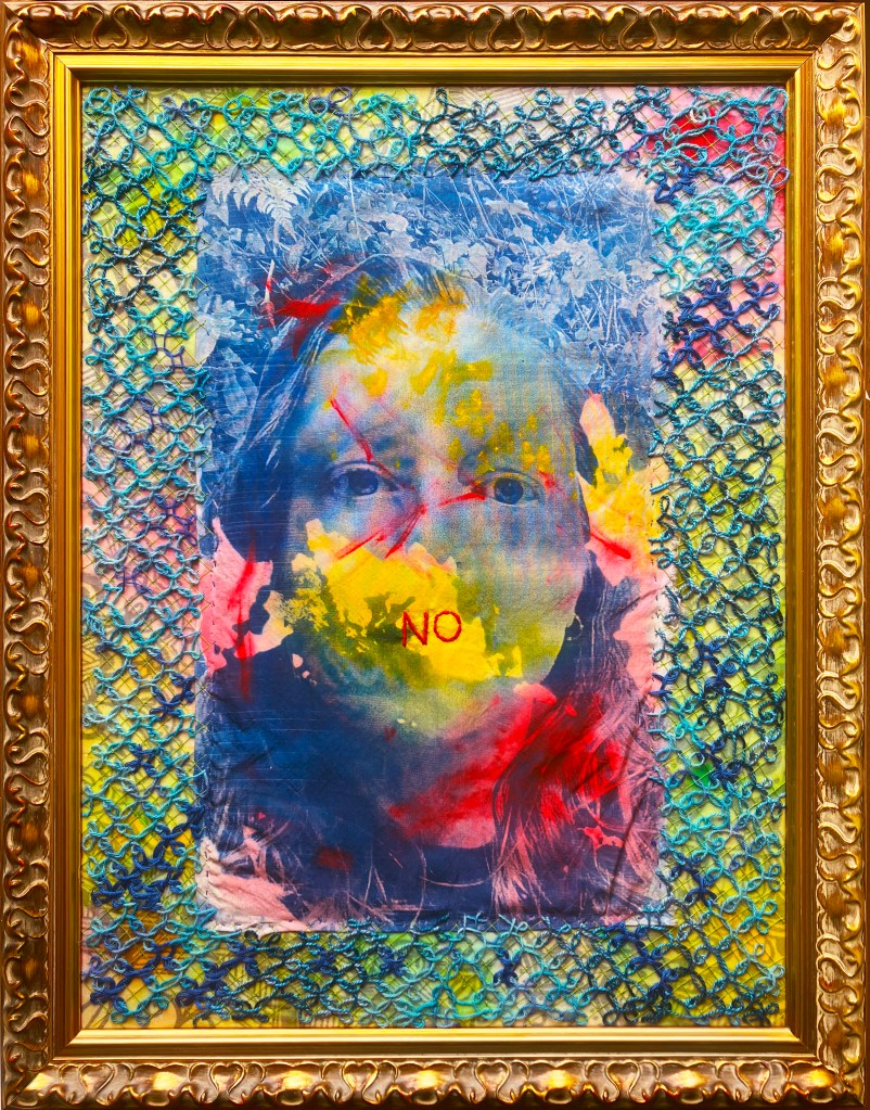 NO (Self-Portrait), cyanotype, acrylic, and emrboidery on silk